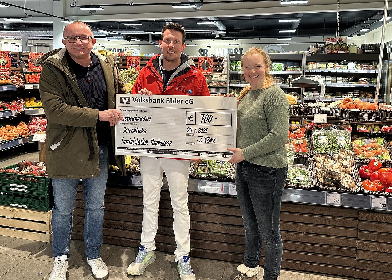 Die Kirchliche Sozialstation Neuhausen freut sich, dieses Jahr der Empfänger der Pfandbon-Spendenaktion des EDEKA Fleck Marktes Neuhausen zu sein und die damit verbundene Spende von über 700 Euro zu erhalten. Zusammen mit Alexander Eggert, Florian Joffroy (Bild Mitte) und Corinna Fleck fand die Übergabe am 20.02.2025 statt. "Diese Unterstützung zeigt uns, dass unsere Arbeit wertgeschätzt wird", betont Florian Joffroy und bedankt sich sehr herzlich bei Familie Fleck für die Spende. "Wir werden die Spende für Fort- und Weiterbildung, unsere Demenzgruppe und die Nachbarschaftshilfe sinnvoll einsetzen. Somit wird die Spende einen positiven Beitrag zu unserer Arbeit leisten."